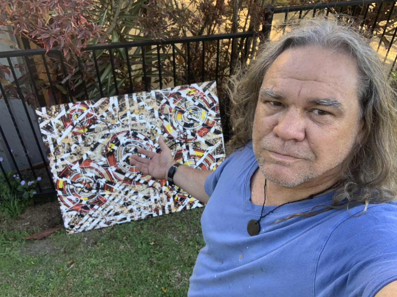 Syncopation meets Synaesthesia, I see Music; shows ways in which we absorb the world around us and are stimulated through sensory perceptions. As a relationship between at least two different time intervals, this art is about overlapping of ideals. Like life, the way to interpret Syncopation Meets Synaesthesia. I see Music needs a Goanna’s close up and grounded interpretation and also an Eagle’s aerial perspective to get the pictures’ whole meanings. Within the layers, there are the industrial western points of view represented with the grids of black and white (ala Roman roads) maps of coming from and going to and the 5 campsites are our First Nation’s worlds showing the different colours and layers of who we are-our identity shown in a natural way. Dendroglyphs or the diamond shapes are our initiation sites of ceremonies/Yulagi. They are also grids of black and white, referencing where we come together. They are standing still, strong and ready to show our methods of being, knowing, doing and valuing-our coming home. Synaesthesia is a perceptual phenomenon in which stimulation of one sensory or cognitive pathway leads to involuntary experiences in a second sensory or cognitive pathway.